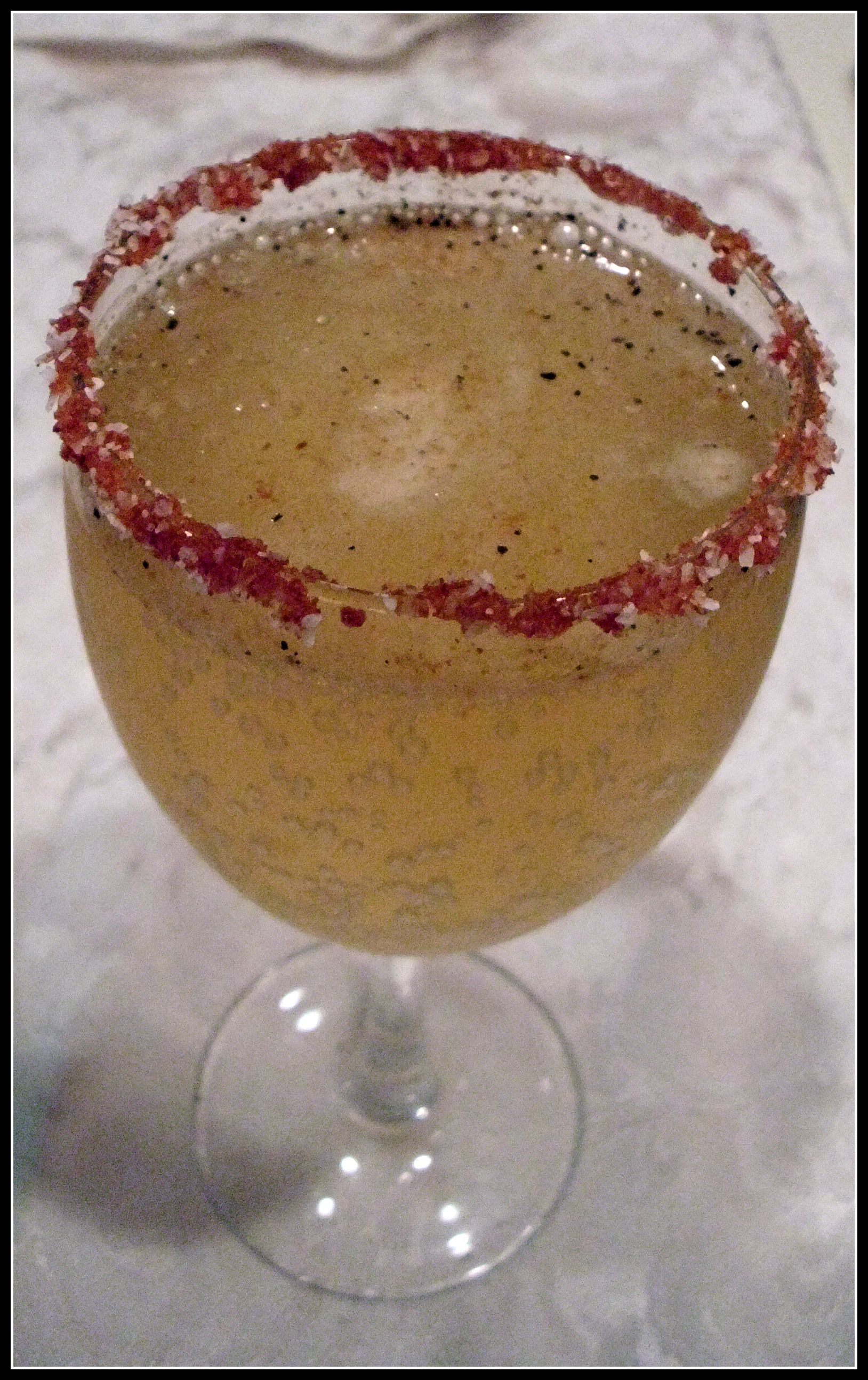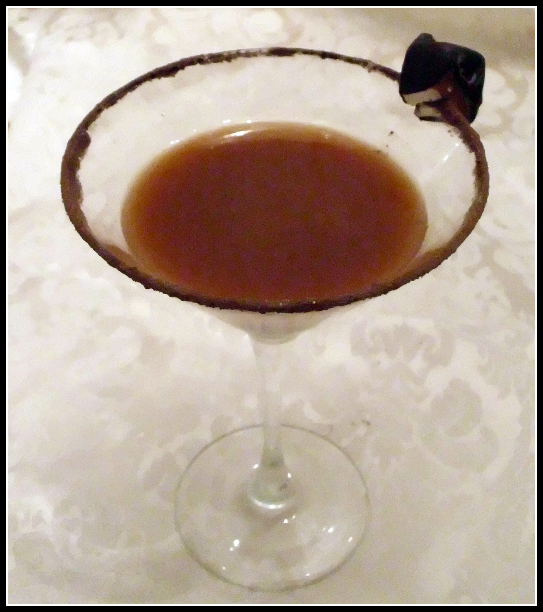 Note: I decided to rim my glass with equal parts unsweetened dark cocoa and splenda.