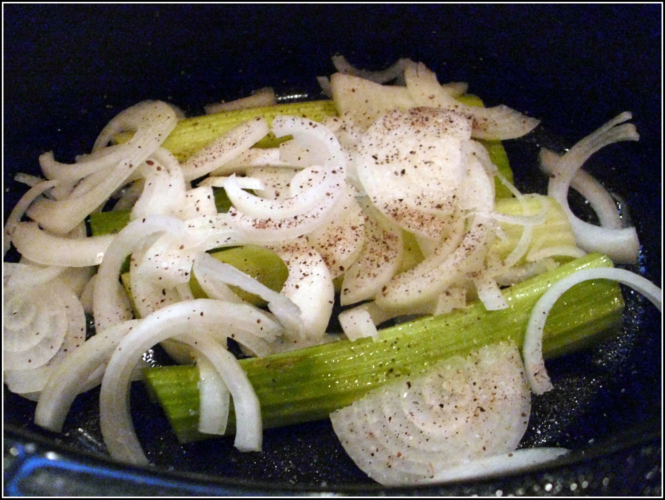 • Cover the celery with half of your sliced onions.  Season with salt and pepper to taste.
