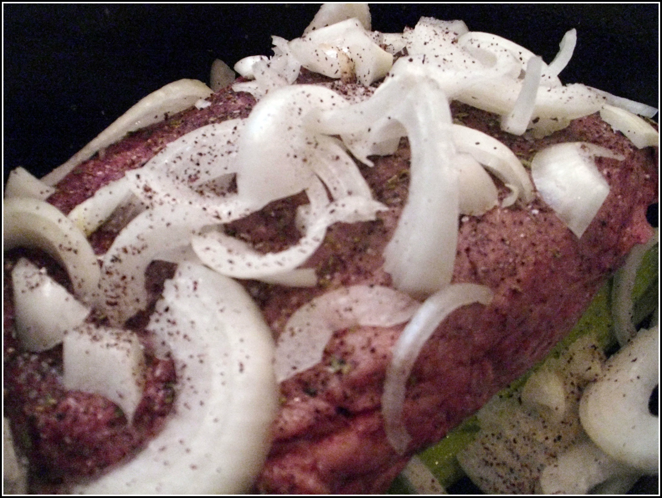 • Season the London Broil with salt, pepper, garlic powder and oregano.  Place in slow cooker.
